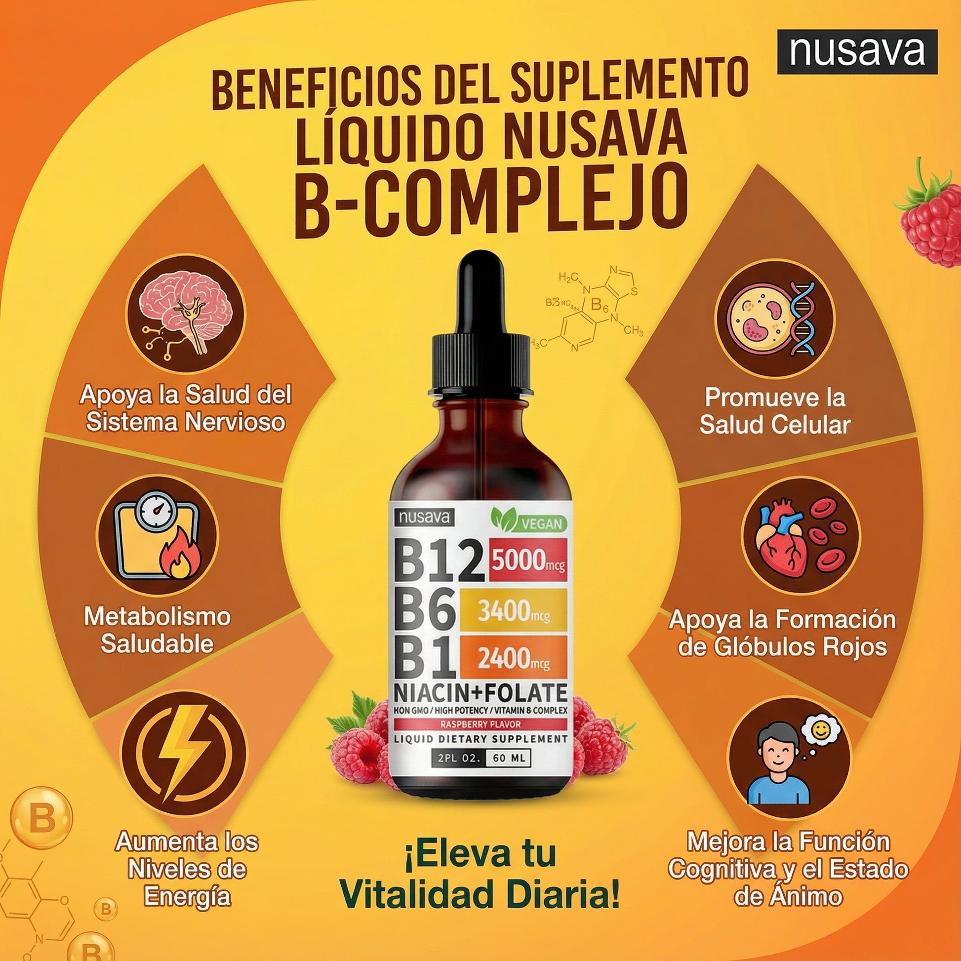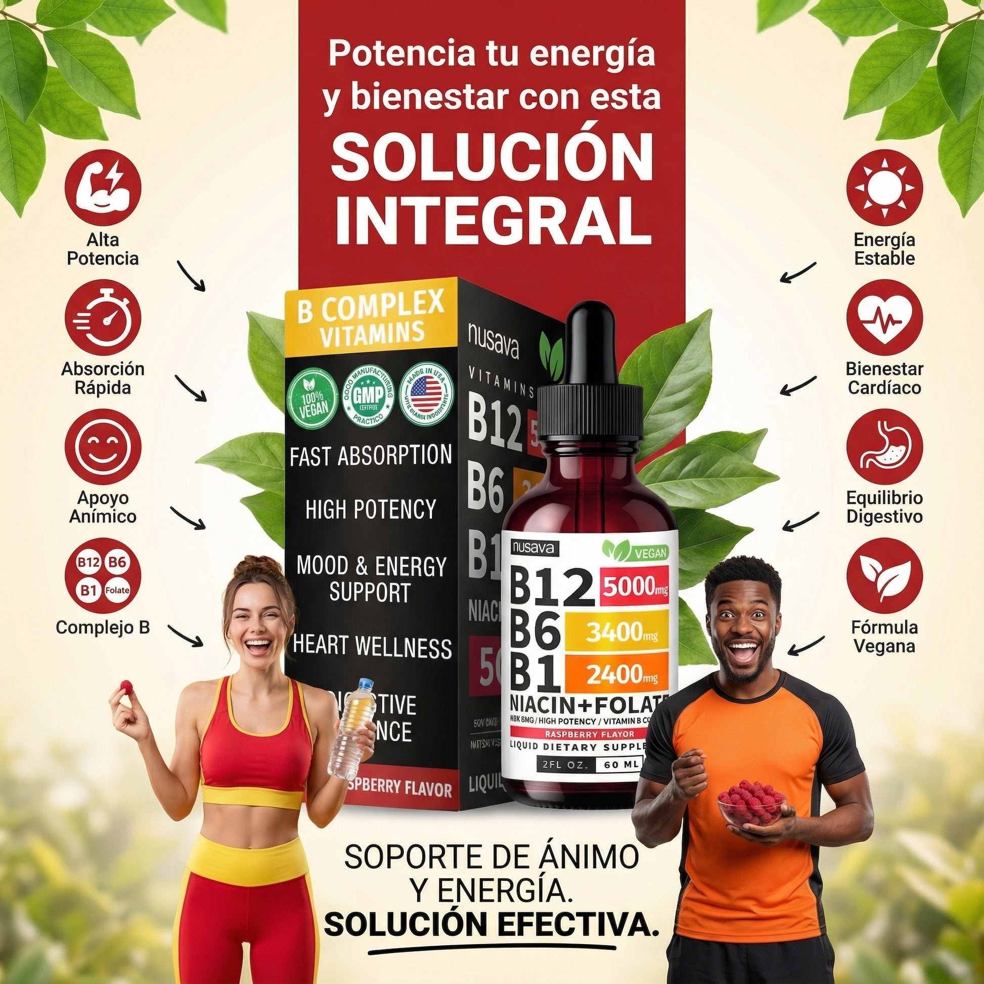 Nuestro Complejo de Vitaminas B líquido ayuda a recuperar la energía diaria, mejorar el ánimo y reducir la fatiga gracias a su alta concentración de B12, B6 y B1.